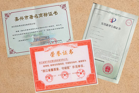 紅旗過濾全自動(dòng)過濾機(jī)專利證書和多項(xiàng)榮譽(yù)證書